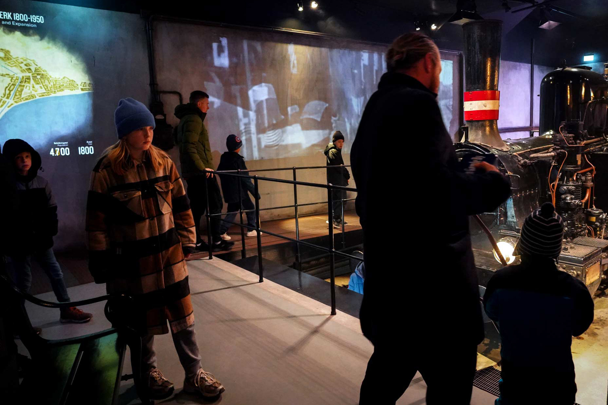 Im Abschnitt „Vokseværk 1850-1950“ über das Wachstum der Stadt kann es unvermittelt zu lauten Geräuschen und Dampfentwicklung durch die Lokomotive kommen.