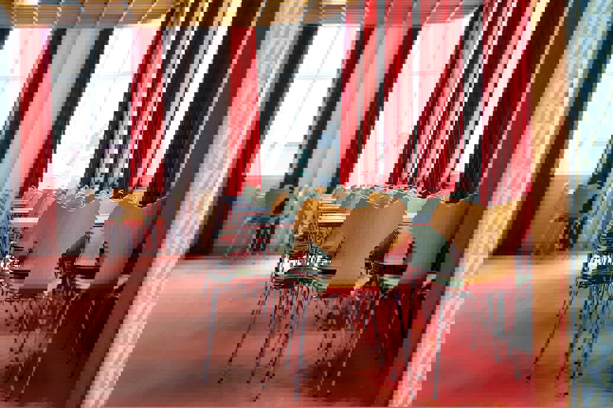 Den danske arkitekt Arne Jacobsens design sætter præg på rummet med Grand Prix stolene, tapeterne og lamp­erne, som han tegnede i 1950’­erne. Bordene stammer fra den klas­siske, skandinaviske bord-kollektion tegnet af Piet Hein, Arne Jacobsen og svenske Bruno Mathsson. Det flotte gulvtæppe og de høje gardiner, giver en god akustik.