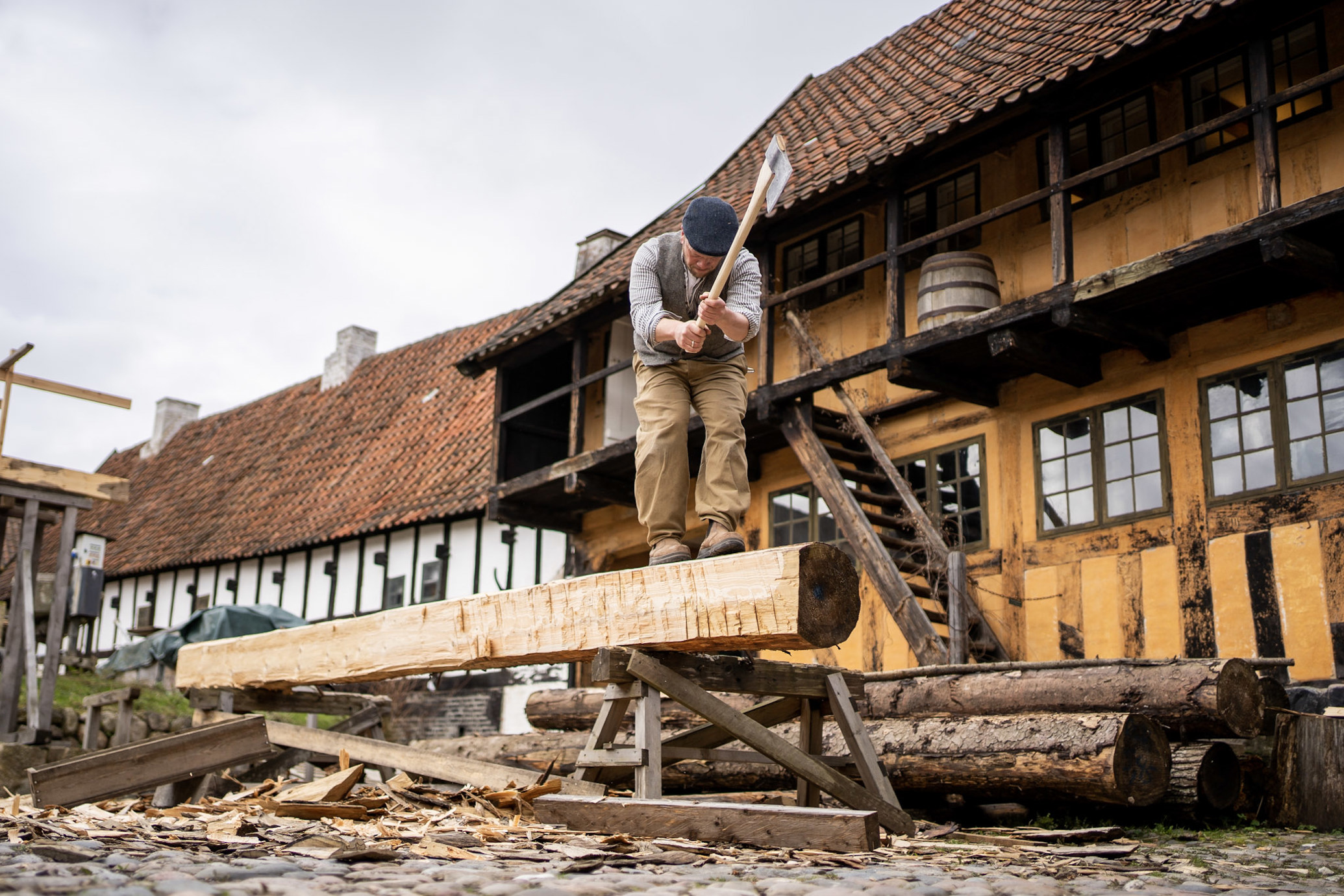 I Den Gamle By praktiseres tømrerfaget med bindingsværk som et af kerneområderne.