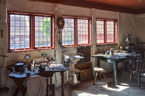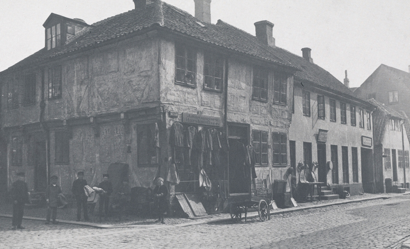 I et gavlhus, fra renæssancens Aarhus, er indrettet værksteder for bogbinder og gravør. Bindingsværkhuset stammer fra Tværgade, det nuværende Nørreport i Aarhus og er fra ca. 1625. Det sort/hvide billede er fra ca. 1895.