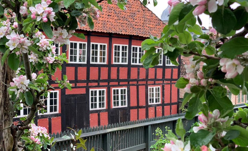 Huset var oprindelig en del af en stor købmandsgård, der blev opført i Vestergade 23 omkring 1750. Bindingsværkshuset i den stærke røde farve blev opført med tømmer fra renæssancen. Derfor er det af kraftig kvalitet, men også meget enkelt uden fremspring mellem stokværkene – etagerne.