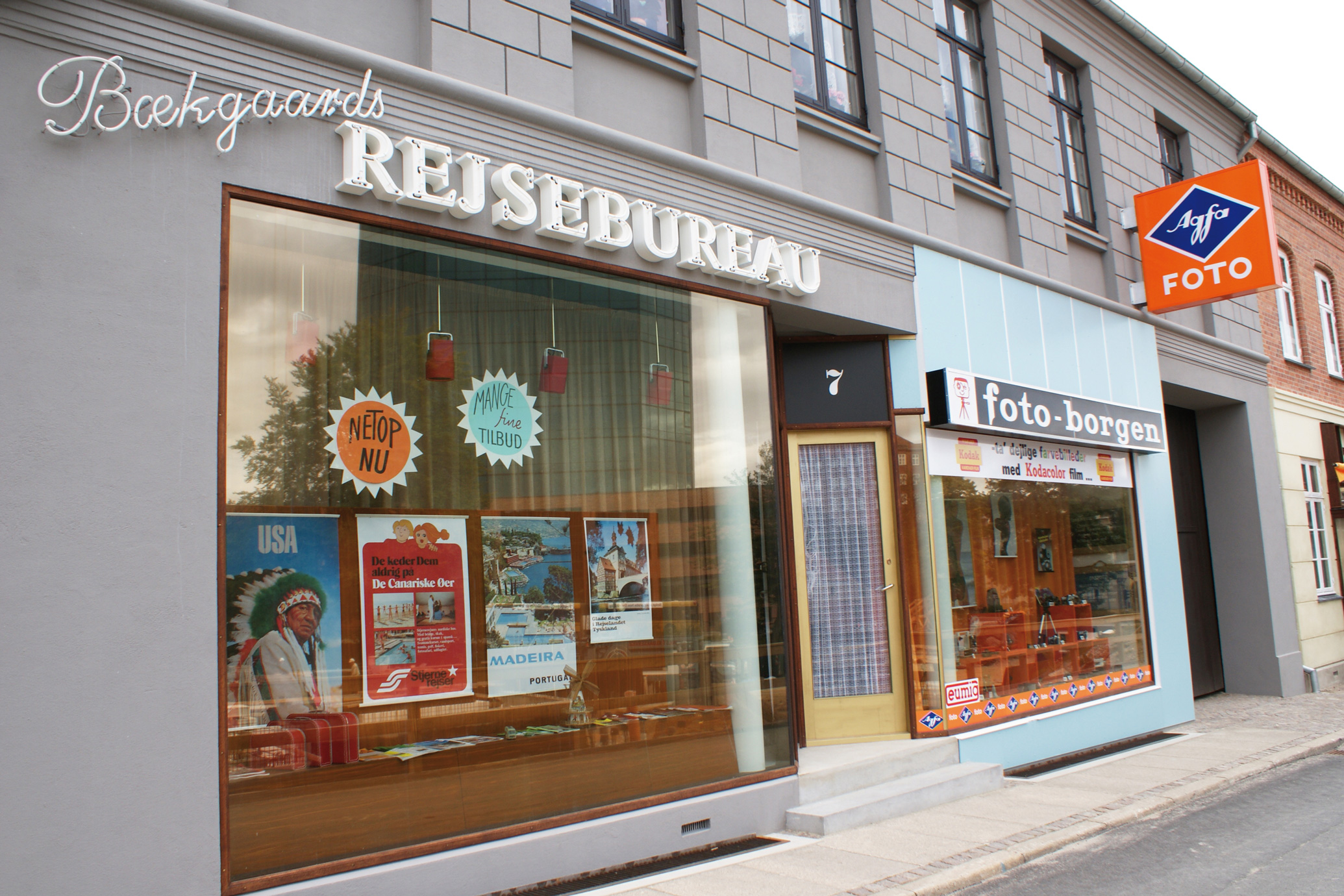 I Den Gamle By pryder to butiksfacader bygningen: Bækgaards Rejsebureau og Fotoborgen. Søjleindgangen markerer indgangen til Dansk Plakatmuseum og Kunstkammeret. Formålet er, at bygningen - der indvendigt er en moderne udstillingsbygning - nu passer ind i 1970’er-kvarteret.