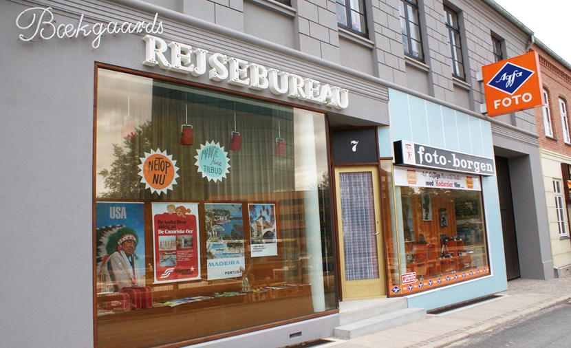 I Den Gamle By pryder to butiksfacader bygningen: Bækgaards Rejsebureau og Fotoborgen. Søjleindgangen markerer indgangen til Dansk Plakatmuseum og Kunstkammeret.