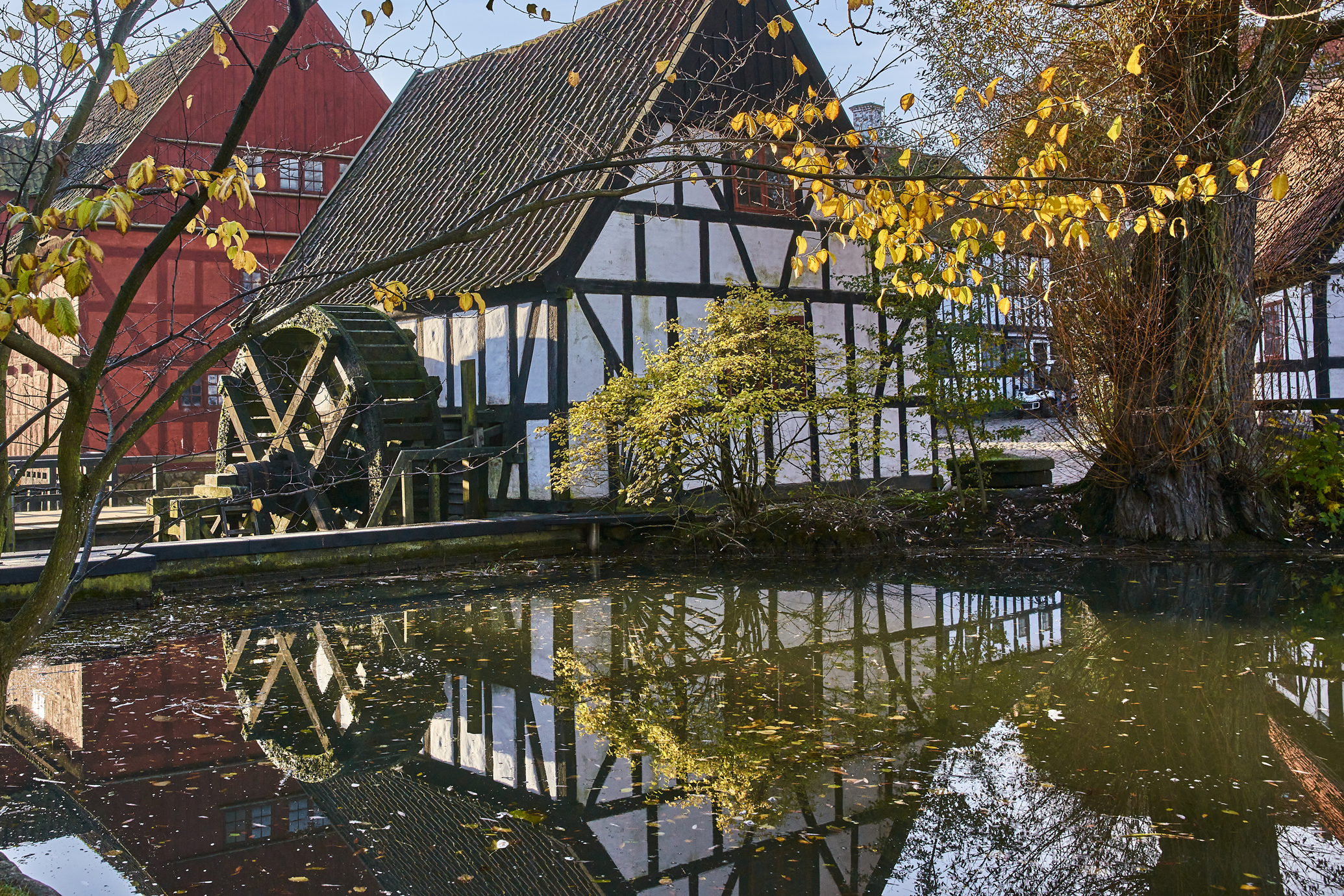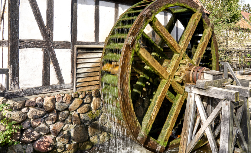 Møllebygningen, der er i bindingsværk, har underfaldshjul.