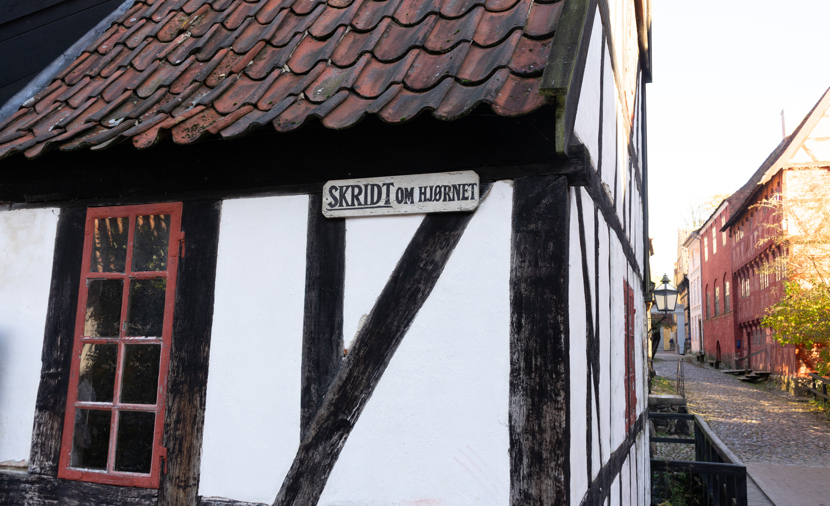 På huset hænger et skilt med ordene "Skridt om hjørnet". Det er et påbud til ryttere og hestevogne om at slå over i skridtgang, inden de runder hjørnet.