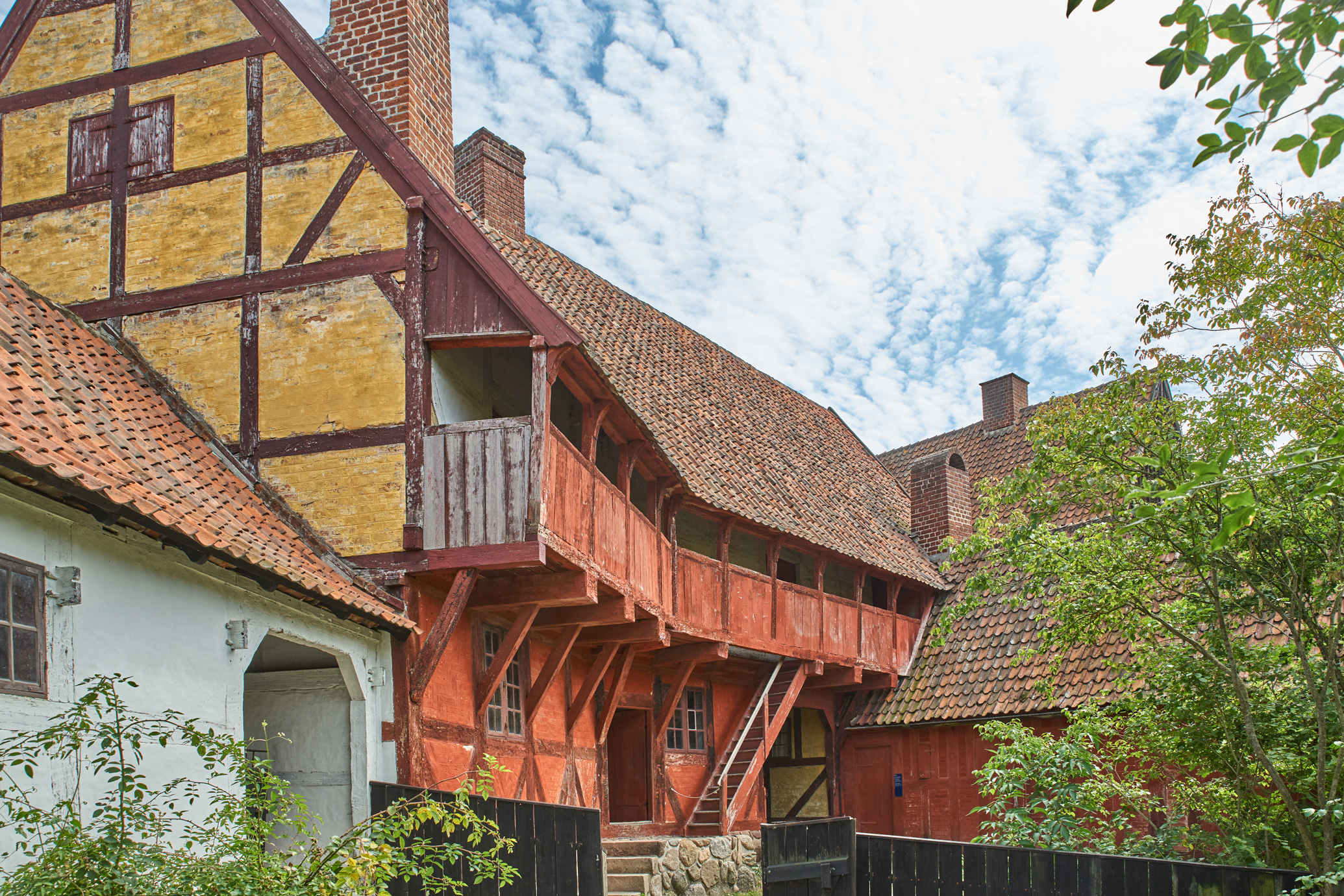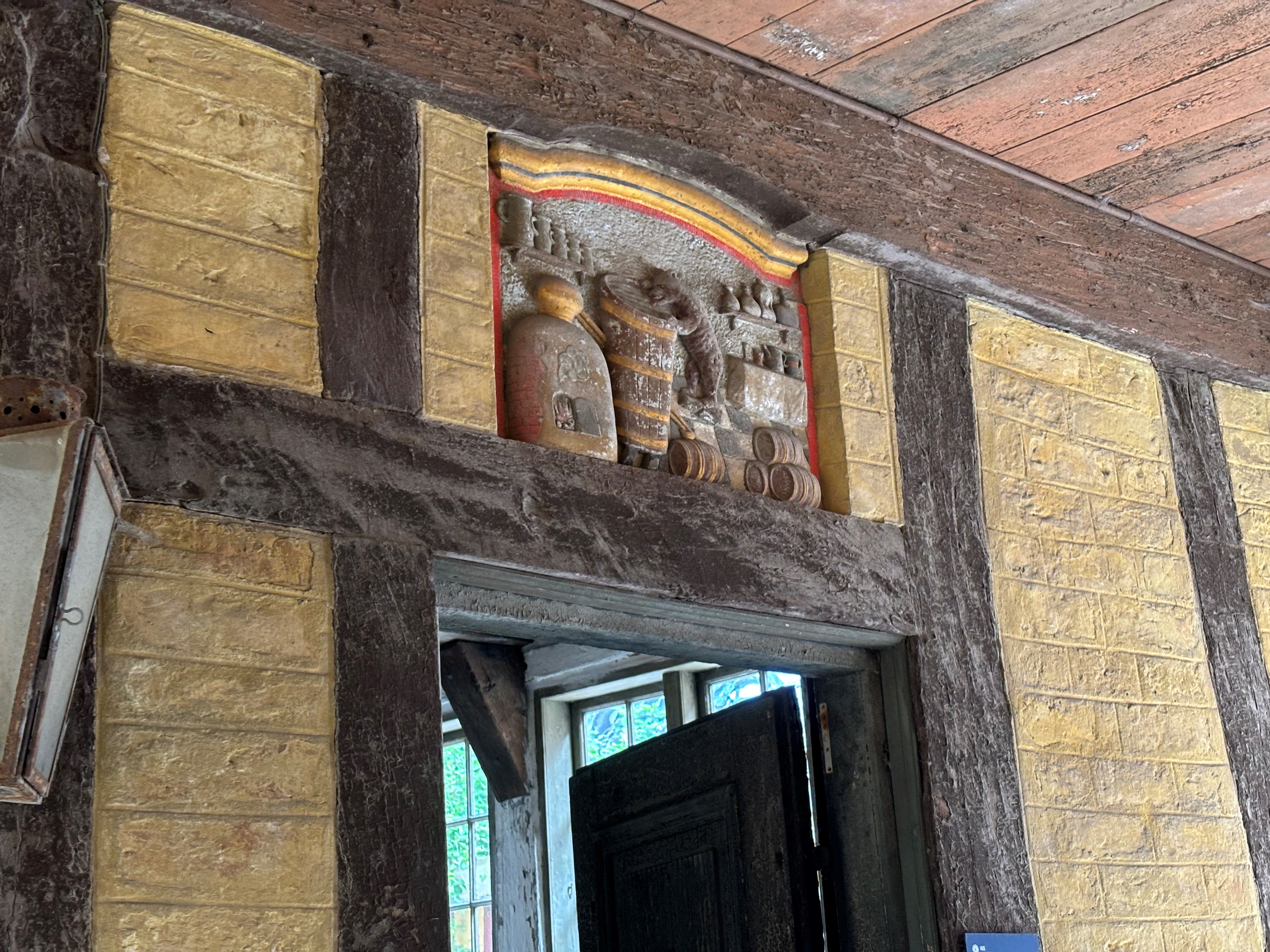 Renæssancebindingsværkshus fra cirka 1625 med enkle knægte uden udskæringer. Stammer fra Jomfru Anegade/Ved Stranden i Aalborg.