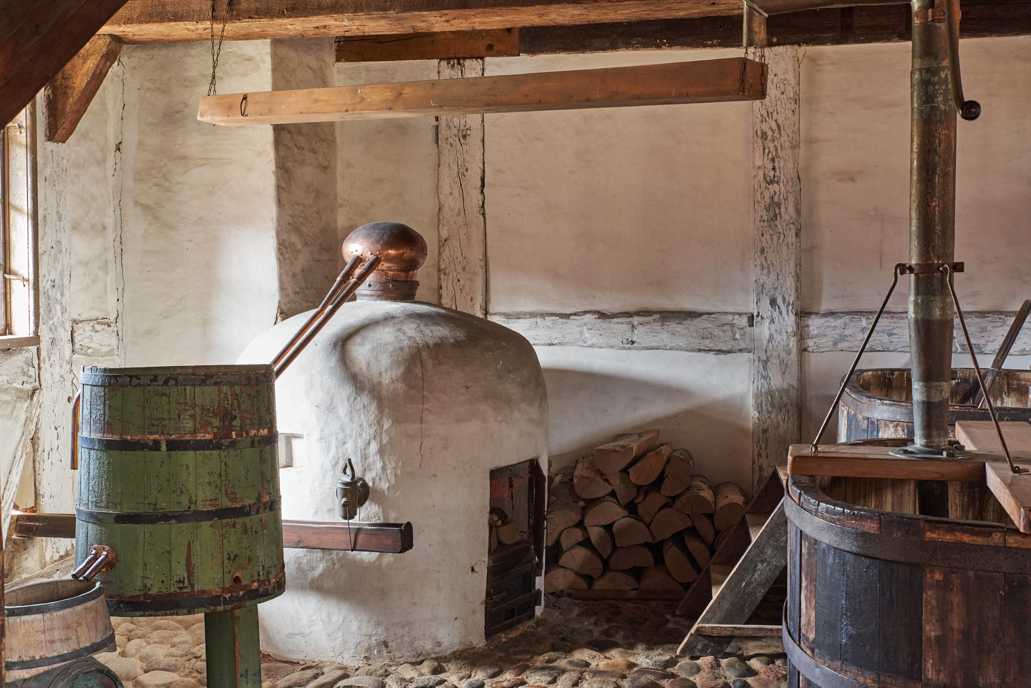 Bindingsværkshuset åbnede i Den Gamle By i 1934 med brændevinsbrænderi, bageri og bagerbutik.