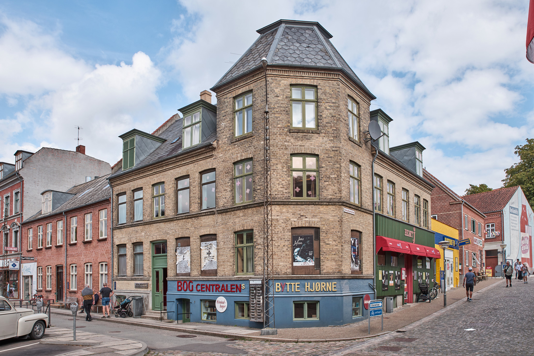 Hjørneejendommen er grundmuret og i to etager og et eksempel på et typisk hjørnehus i en dansk karrébebyggelse. Bygningen har et karakteristisk, sekskantet hjørneparti, der nærmest ligner et lille tårn med afskåret hætte.