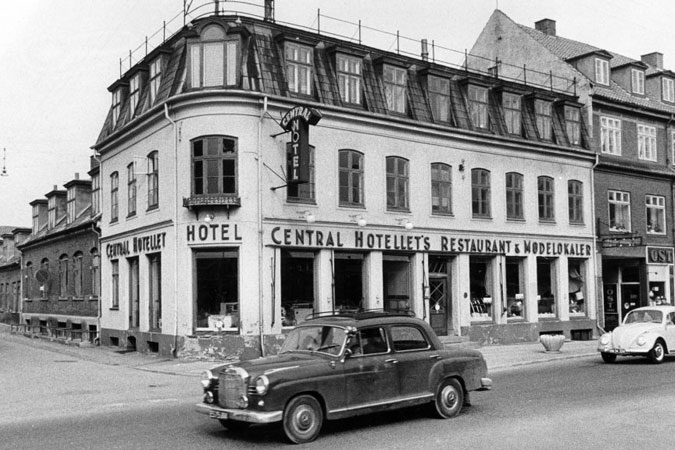 Det sort-hvide foto er af Centralhotellet i Ringsted kort før nedrivningen i 1970, på hjørnet af Nørregade og Parkstræde.