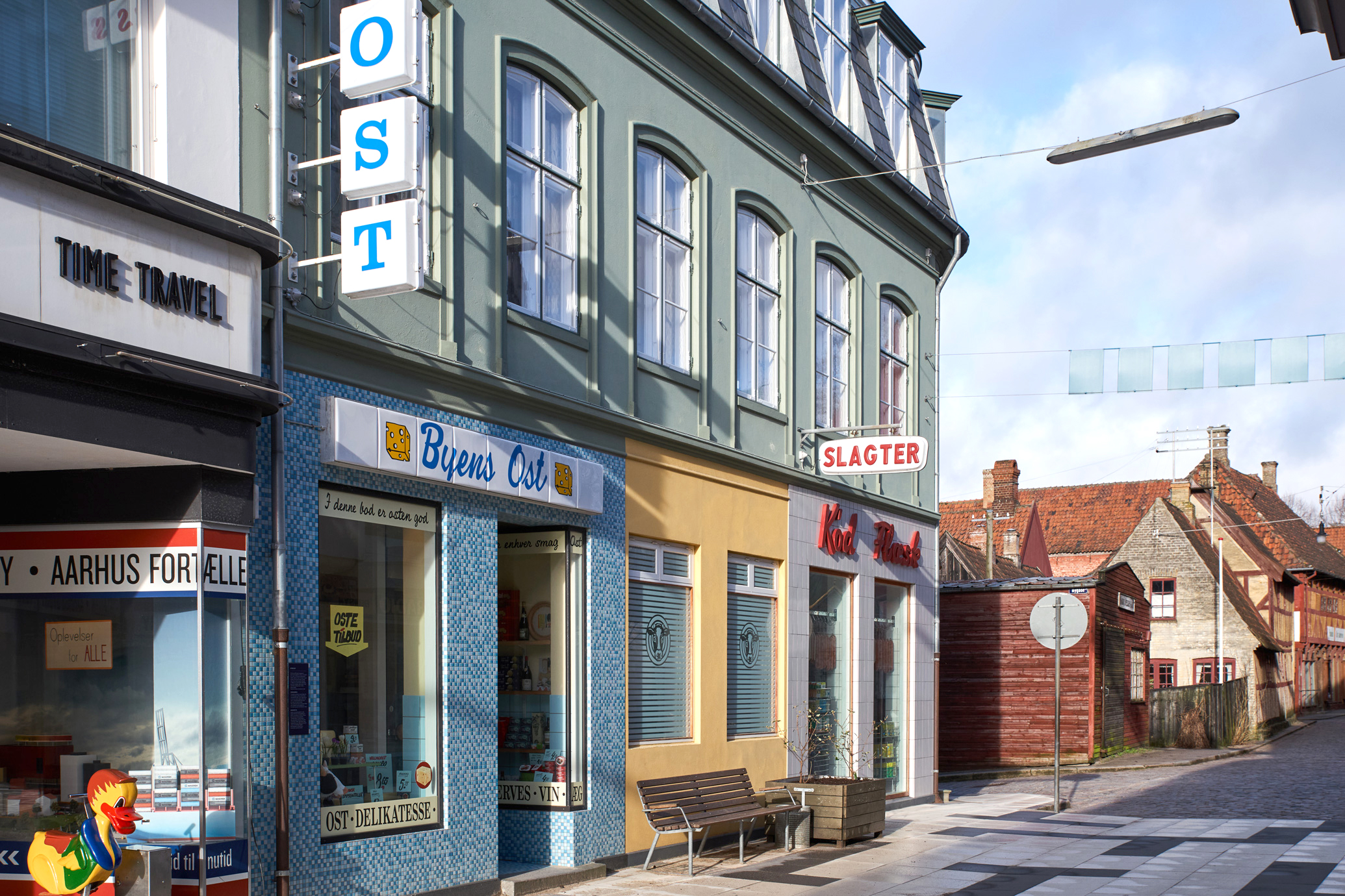 I stueetagen kan du besøge tidstypiske butikker fra begyndelsen af 1970’erne, nemlig en forretning med modetøj til yngre kvinder samt en slagter og en ostebutik.