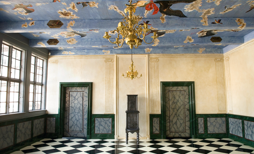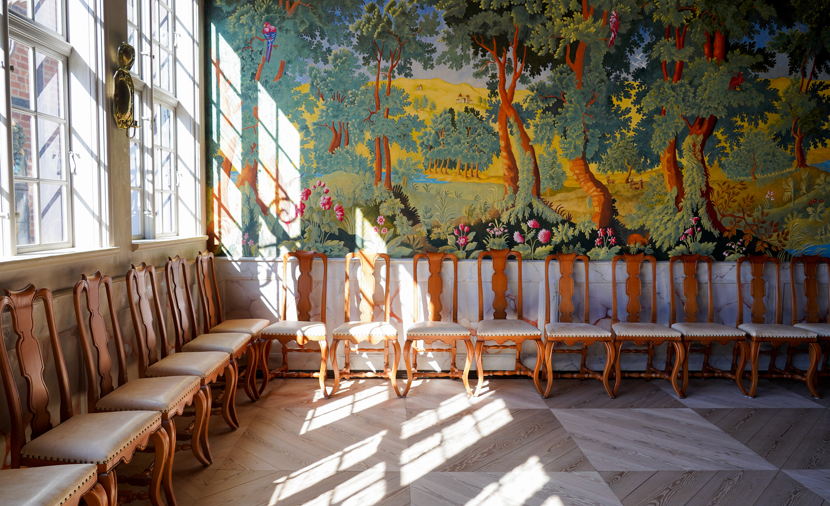 Rummene er muret i munkesten sammen med de skævheder, der var, da huset blev taget ned i 1944. Stolene er kopier fra møbler fra senrenæssancen, og bordene er tilpasset barokstilen. Der er levende lys i væglampetter og stager.