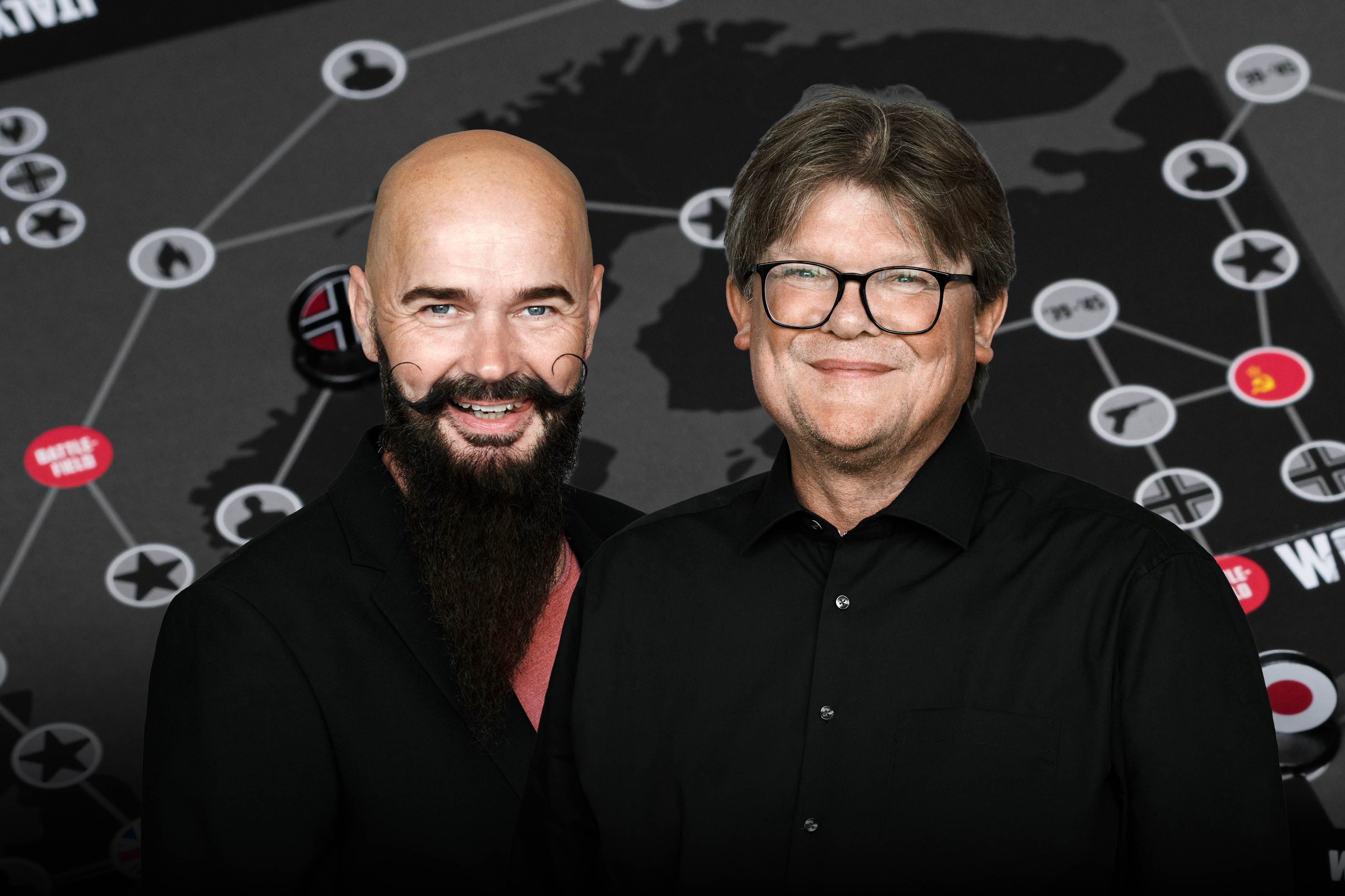 Værterne er Mika Vandborg og Claus Corfixen, rockguitaristen og konsulenten – det umage makkerpar, der skabte en global succes med verdens første triviaspil om Anden Verdenskrig.