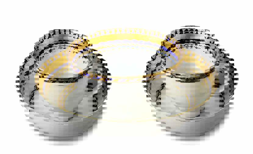 Frederik Warming (1758-1820) blev gift i slutningen af 1790'erne med Antoinette Marie Berg. Til sit bryllup bestilte han i Kina et ostindisk spisestel i porcelæn på flere hundrede dele. Alle stykkerne er dekoreret med en graveret guldbort kantet med smallere borter i blå emaljefarve, hvorover er blade i guld.