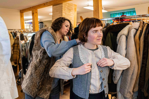 June Ekensteen Nielsen er butiksassistent i Den Gamle By, og hun vælger vestene fra 1864 og 1927, da hun er til prøvning hos Malene Vestergaard Redder på skræddersalen.