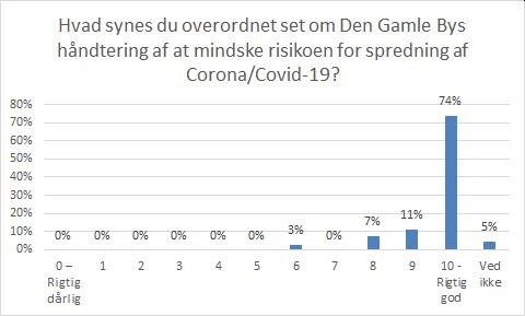 De besøgende blev bedt om at vurdere museet håndtering for at mindske risikoen for spredning af Corona. Den Gamle By har lavet en række tiltag med blandt andet at ensrette udstillingen, sætte spritdispenserer op og informere de besøgende om retningslinjer. De besøgende kunne bedømme museets tiltag på en skala fra 1-10, hvor 10 er er rigtigt godt.
