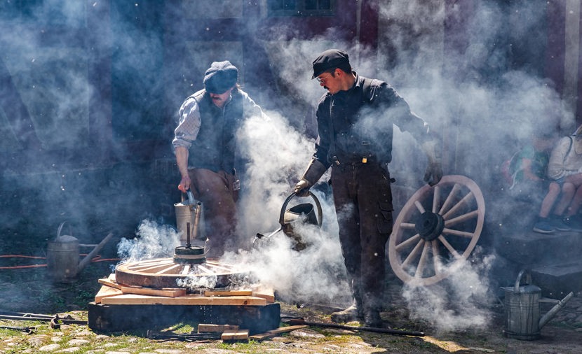 Kom helt tæt på, når beslagsmeden tænder op i essen og viser det krævende arbejde med at beskære hove og lægge sko med varmskoning – en sjælden mulighed for at opleve håndværket i praksis. Se også hjulmageren arbejde, når de store jernringe varmes op og lægges på vognhjulene med præcision og erfaring.