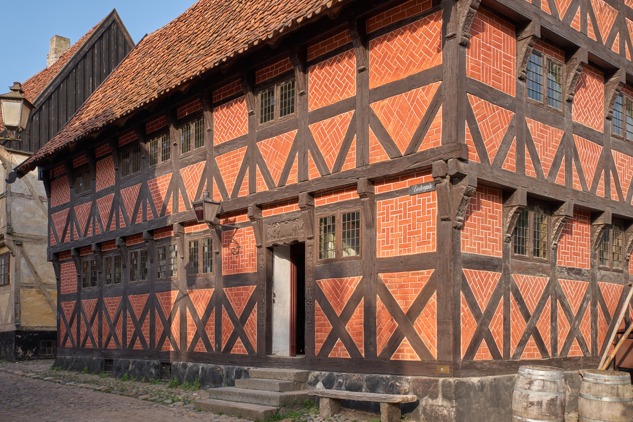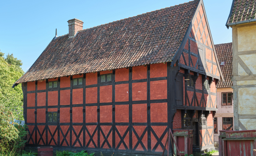 Huset er bygget i bindingsværk i egetræ. Det nederste stokværk har krydsende skråbånd kaldet Andreaskors, som var et karakteristisk bygningstræk i sidste halvdel af 1500-tallet. Mønster pryder murværket, og de blyindfattede ruder var almindelige frem til sidste halvdel af 1700-tallet. Til gårdsiden har bygningen senmiddelalderlige stolper.