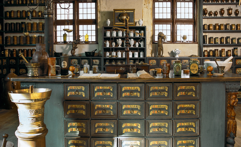 Opført i Den Gamle By 1942 og indrettet som apotek.