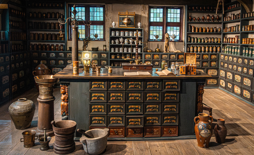 Opført i Den Gamle By 1942 og indrettet som apotek.