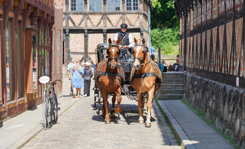 Derfor har Den Gamle By også heste og hestevogne, du kan møde i byen, ligesom du kan se flere historiske hestevogne i byen på udvalgte tidspunkter af sæsonen.