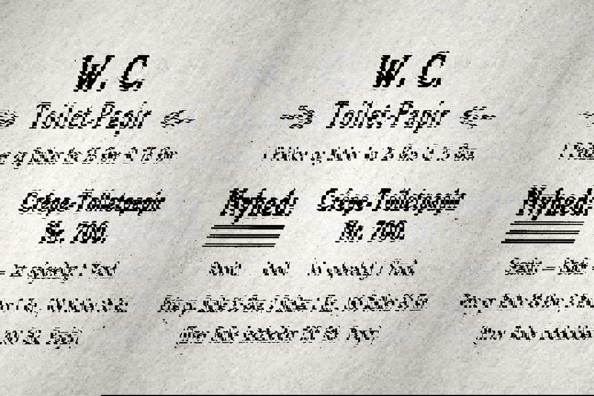 I boghandlerens vindue kan du se en reklame for noget så fornemt som toiletpapir til WC brug. I begyndelsen af 1900-tallet solgte boghandleren alle slags papirvarer - også toiletpapir.