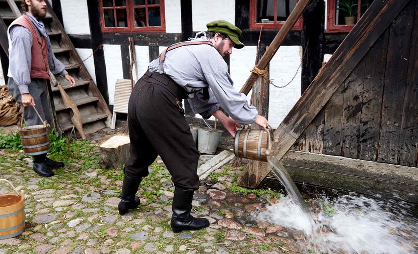 Mød fortidens mennesker, se deres stuer og køkkener, og gå på opdagelse i deres haver. Kig ind i købmandsgården og køb en vaniljekrans hos bageren. Klap hestene, pas på gæssene og prøv stylterne. Byens huse er i bindingsværk og er flyttet hertil fra byer i hele Danmark. Se, hør, duft, smag, prøv, opdag – og forstå.